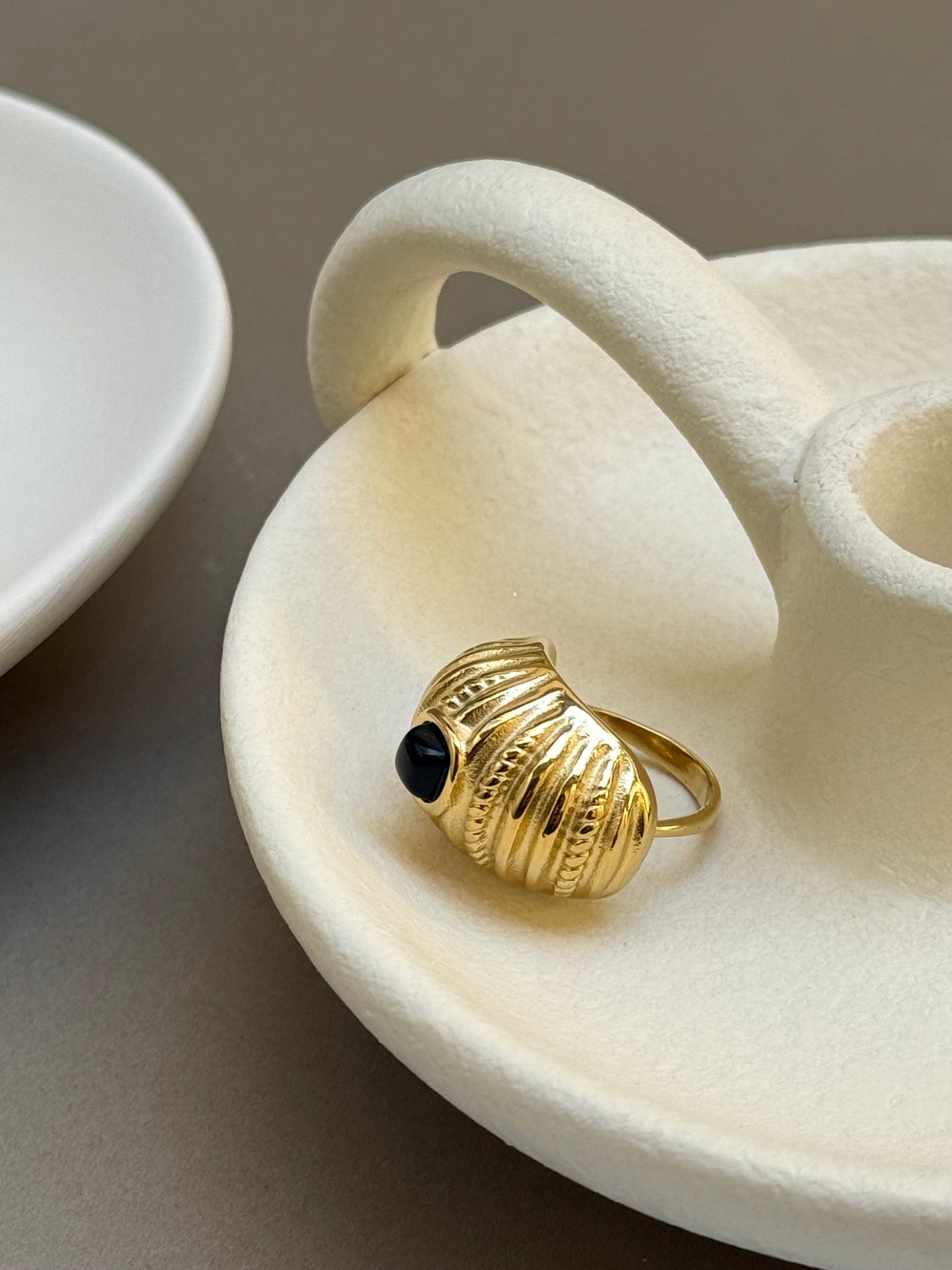 Détails : Bague à stries et sertie d'une pierre naturelle d'onyx noire