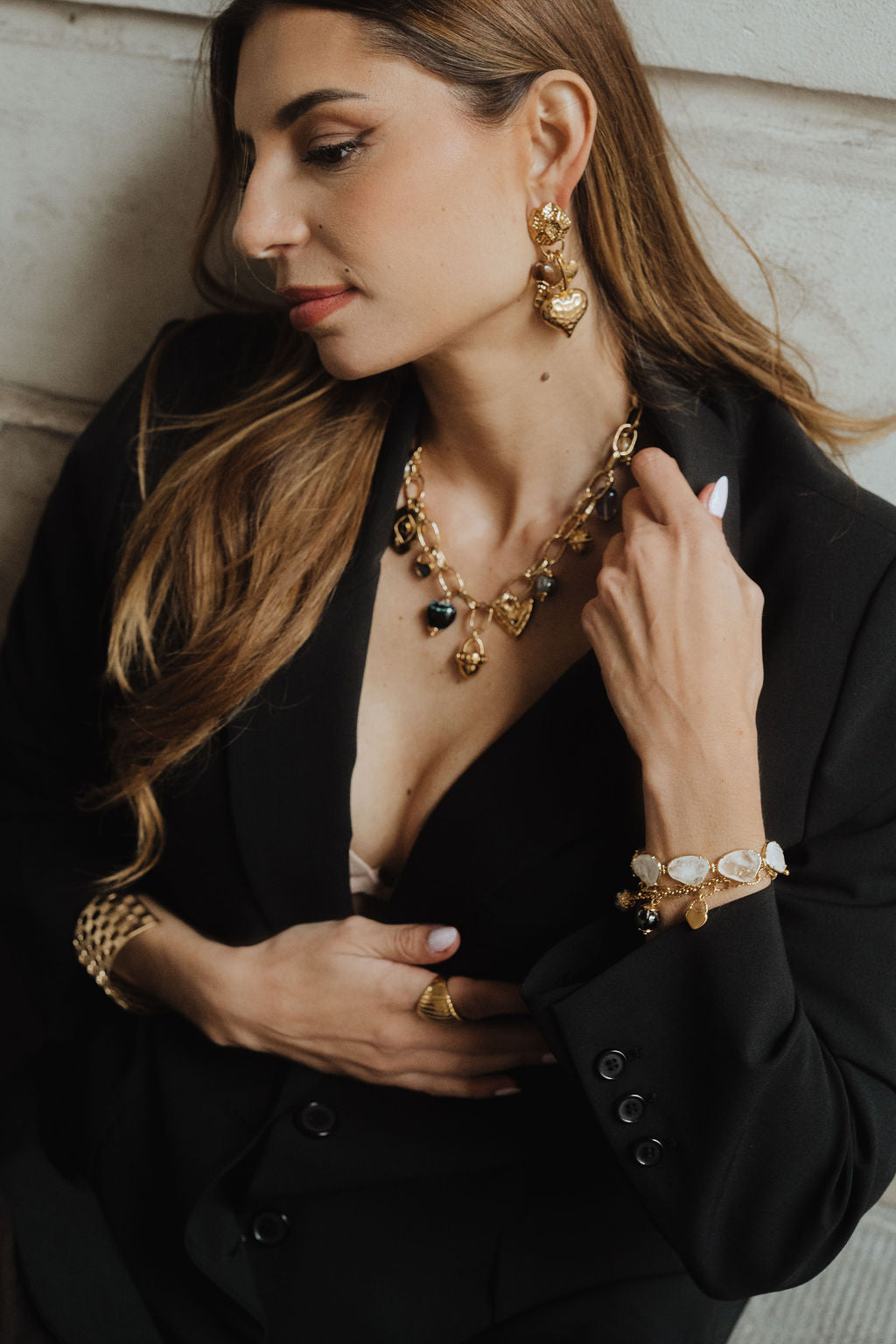 Détails : Des boucles pendantes composées de pampilles coeurs et pierre naturelles marron.
