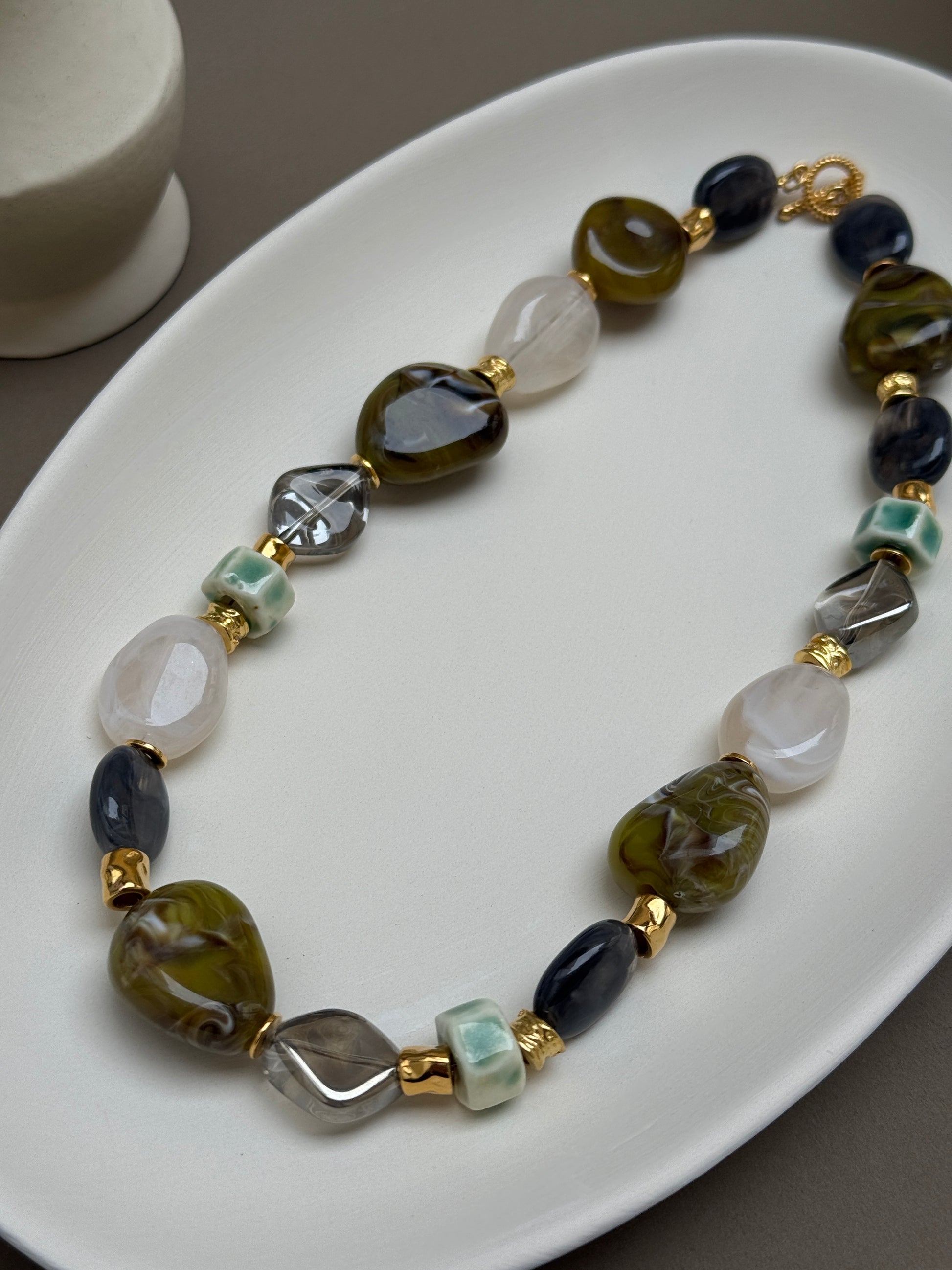 Détails : Collier composé de perles en acétate et en verre
