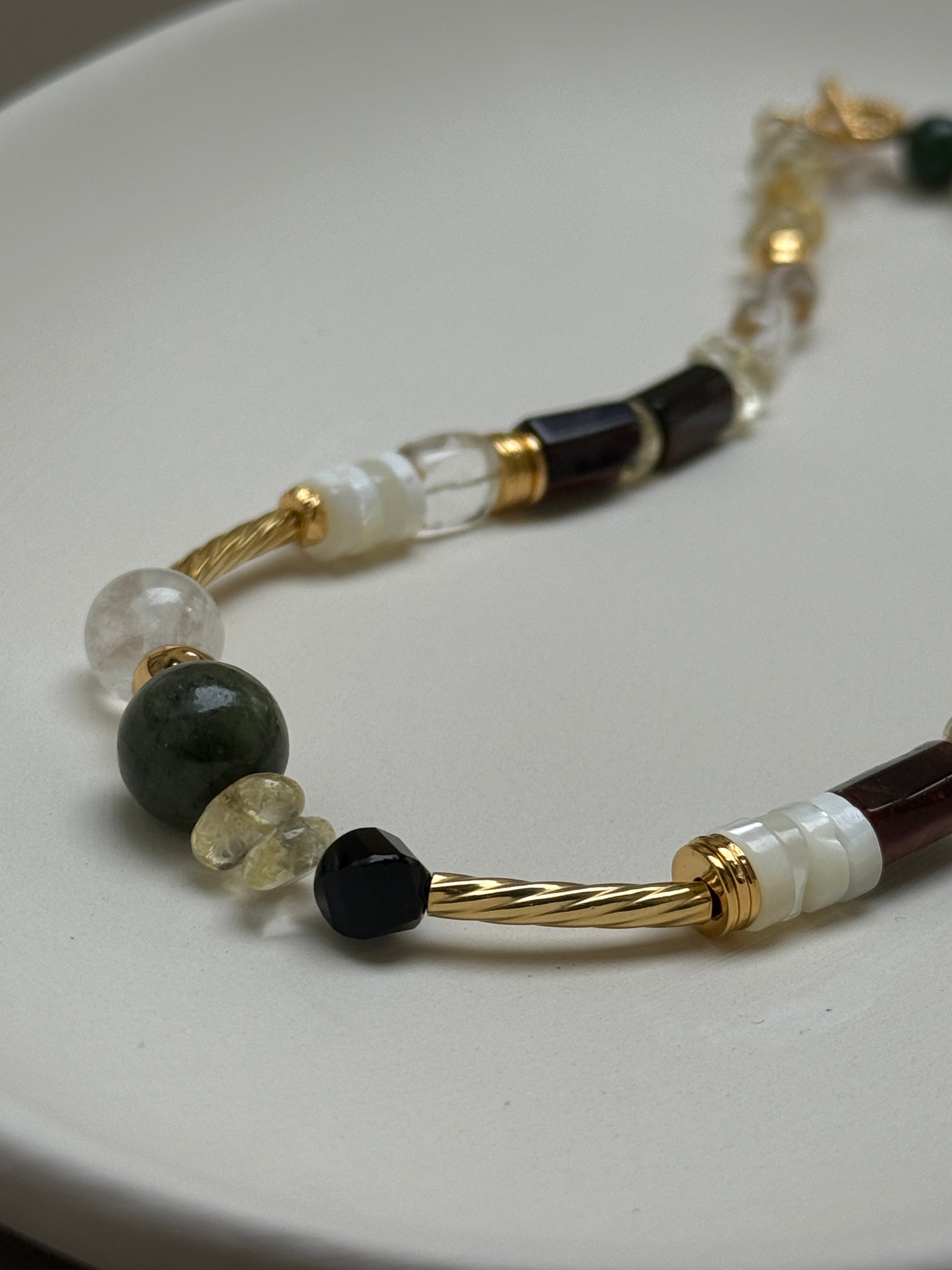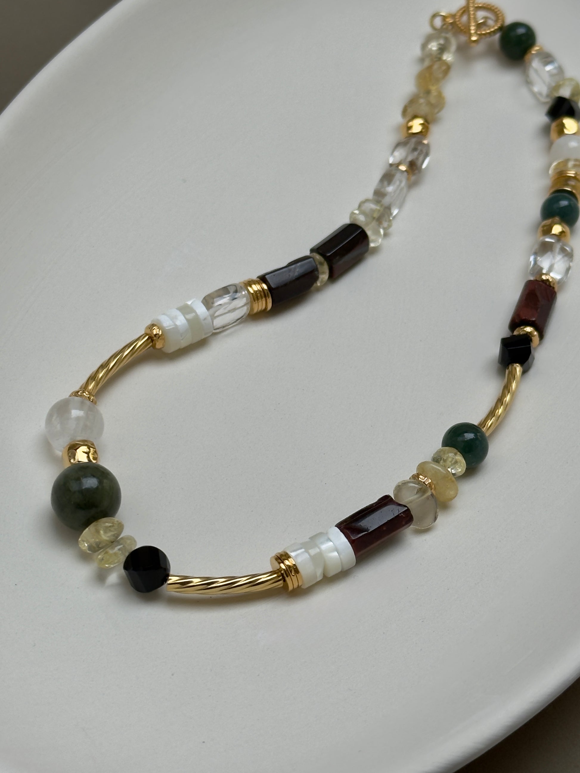 Détails : Collier composé de pierres naturelles, de nacre et de pièces en acier inoxydable.