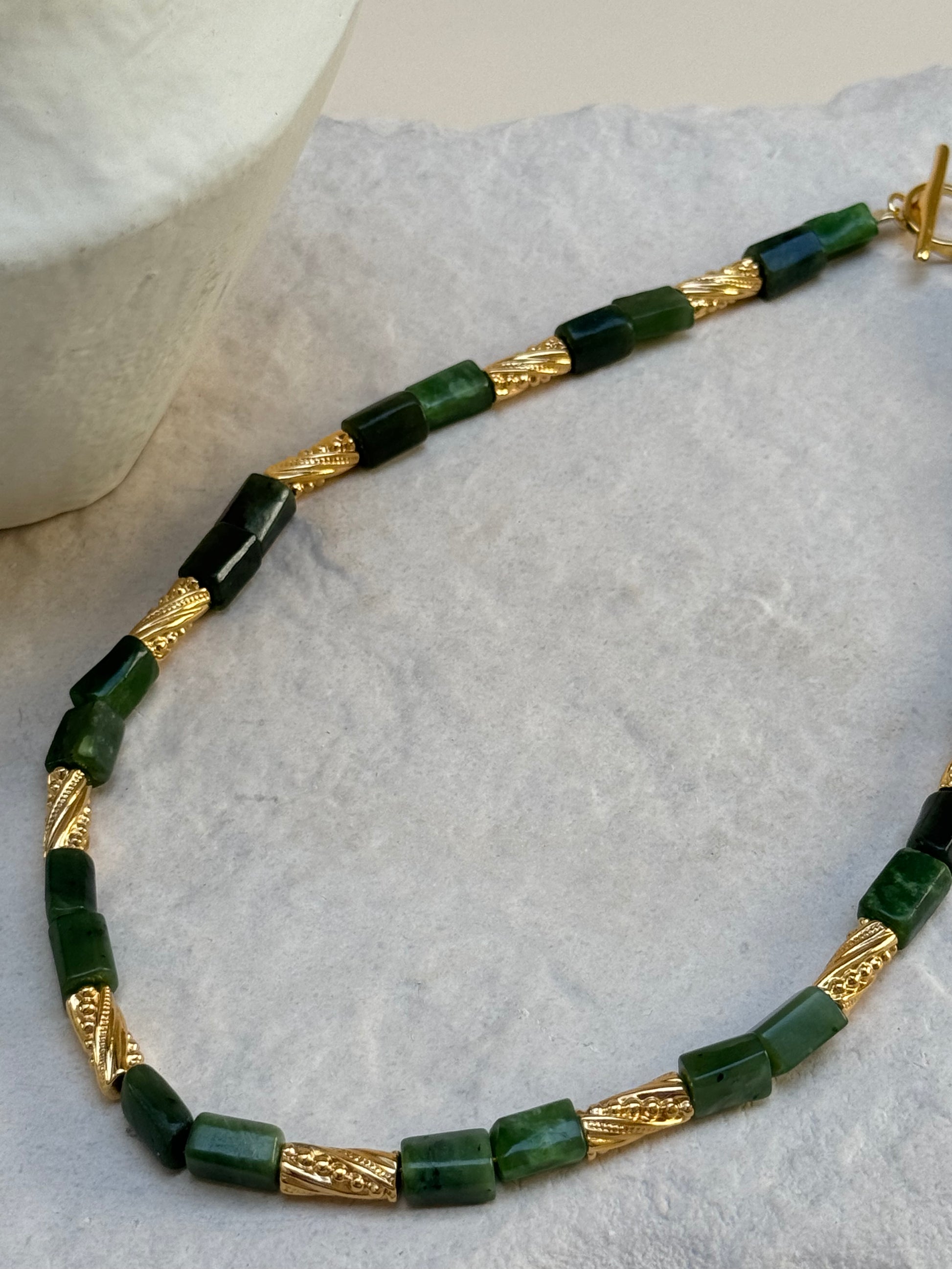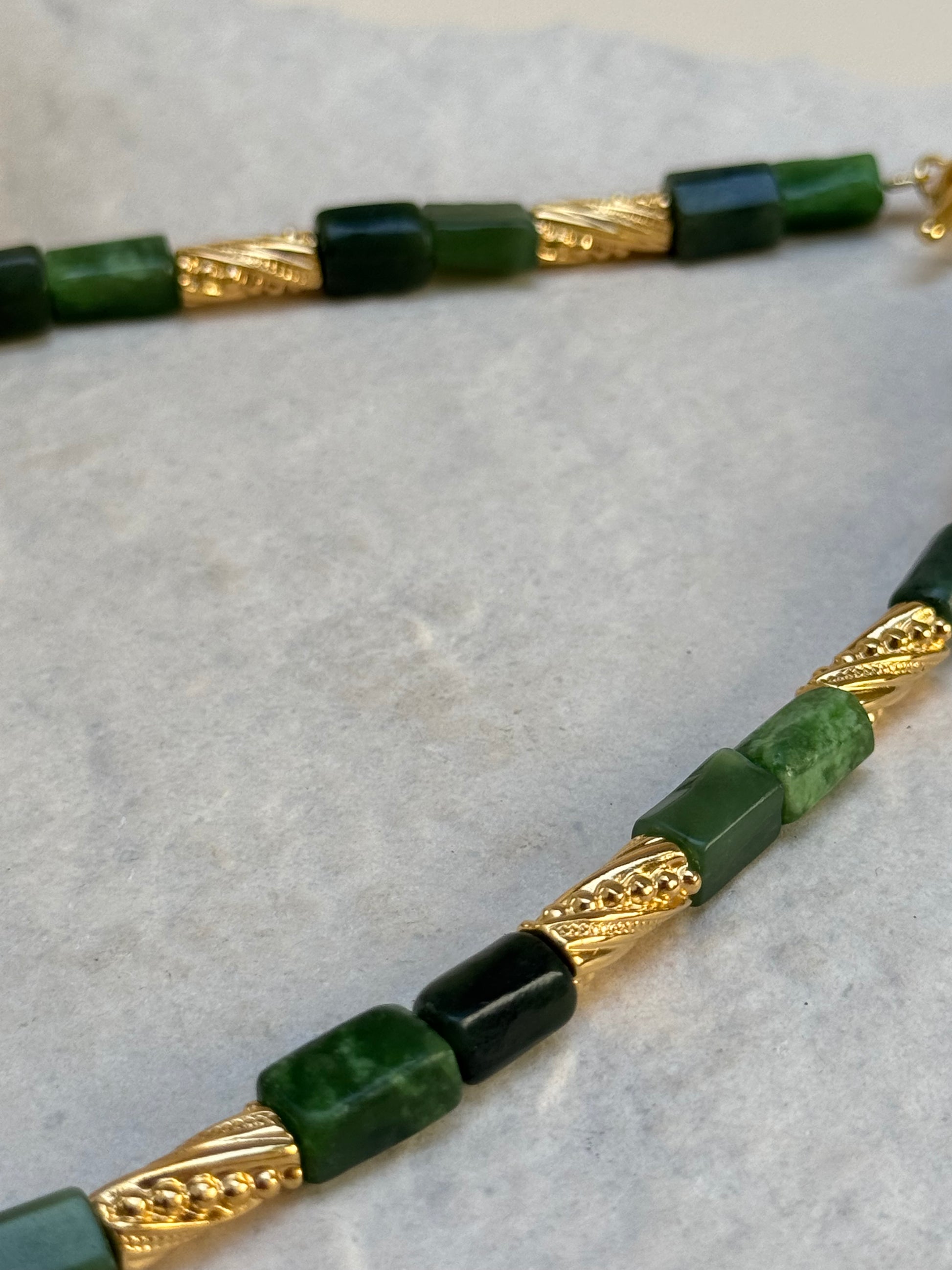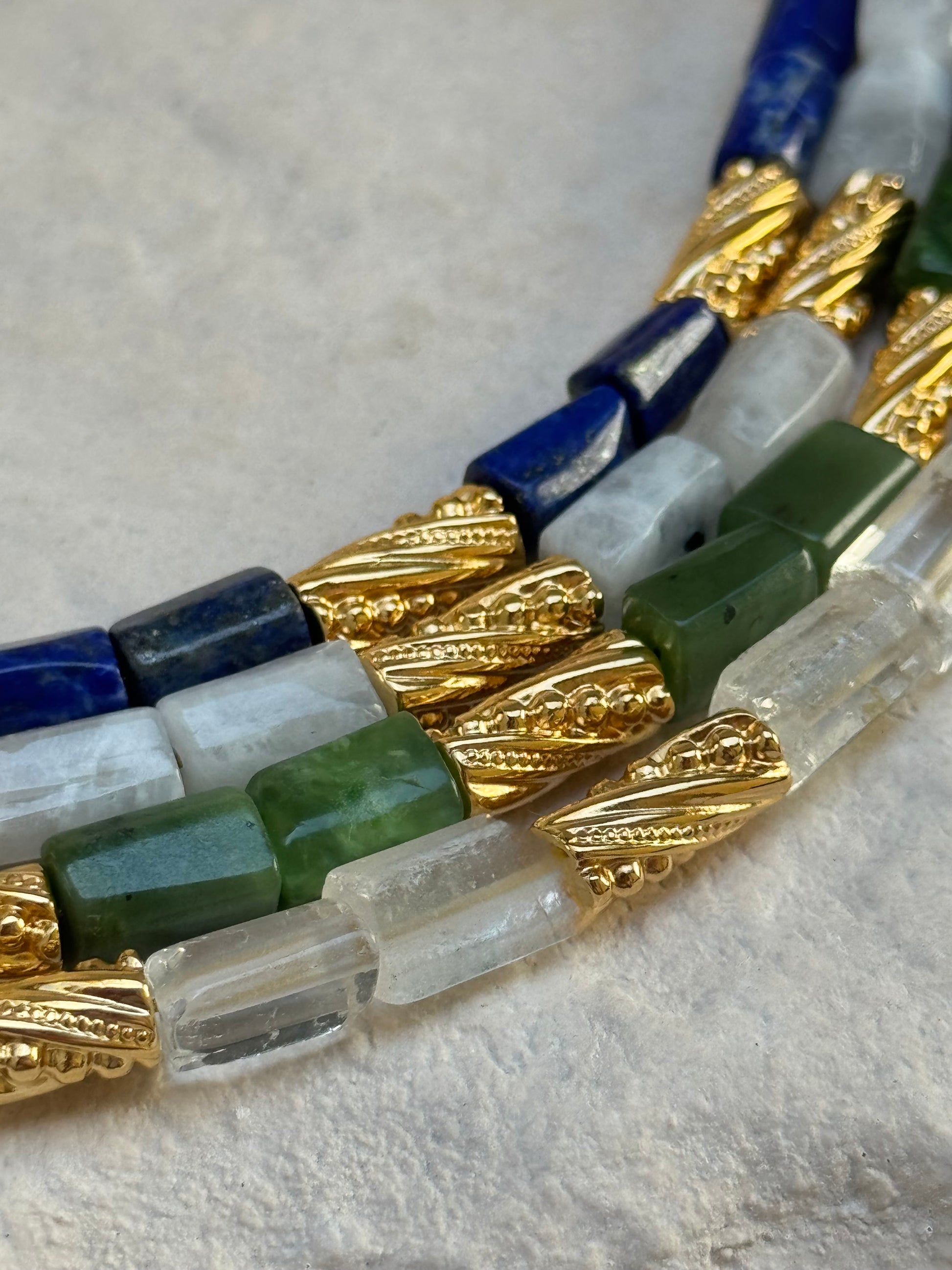Détails : Chaine avec perles en acier inoxydable doré effet torsadé et pierres naturelles