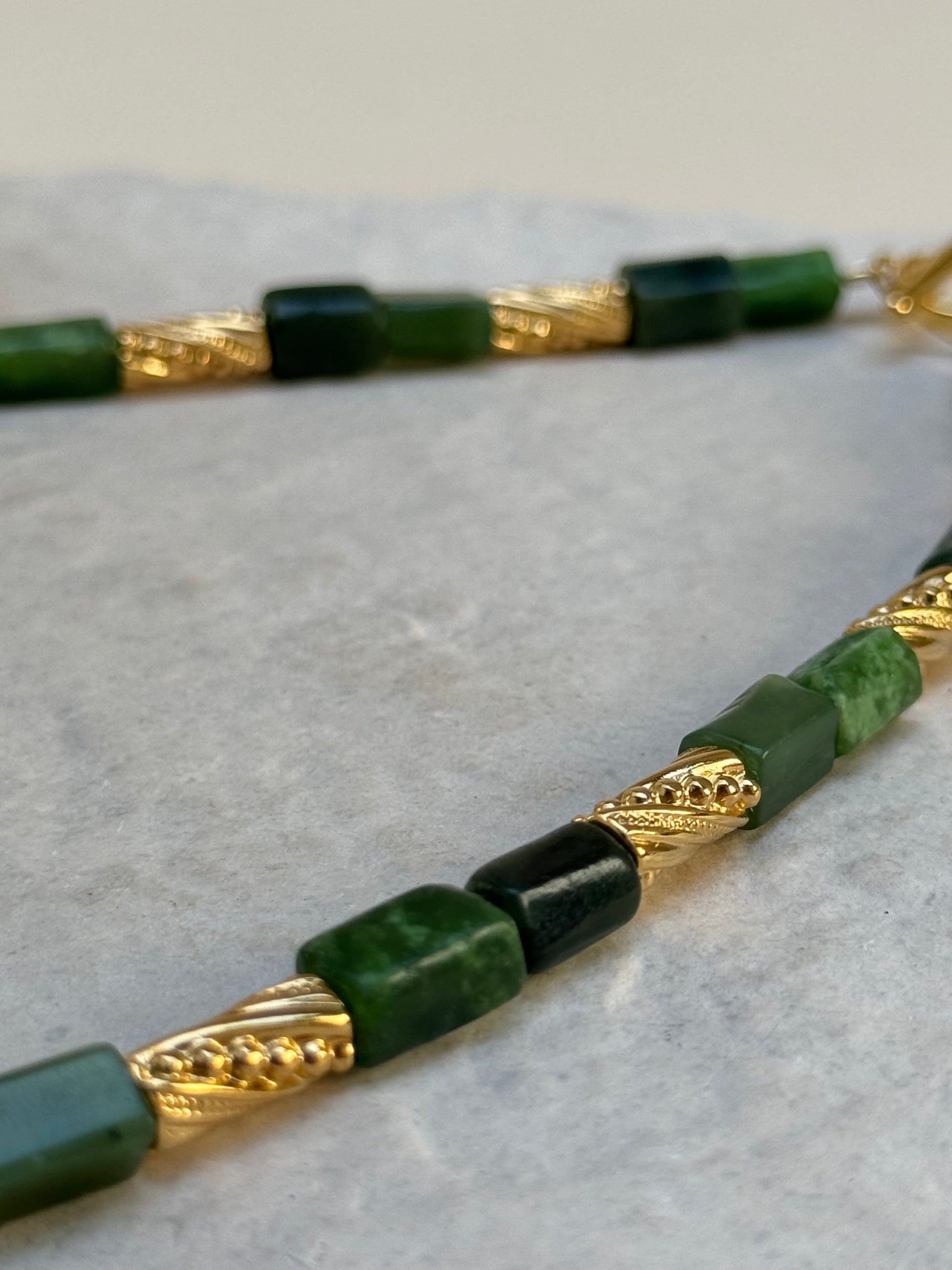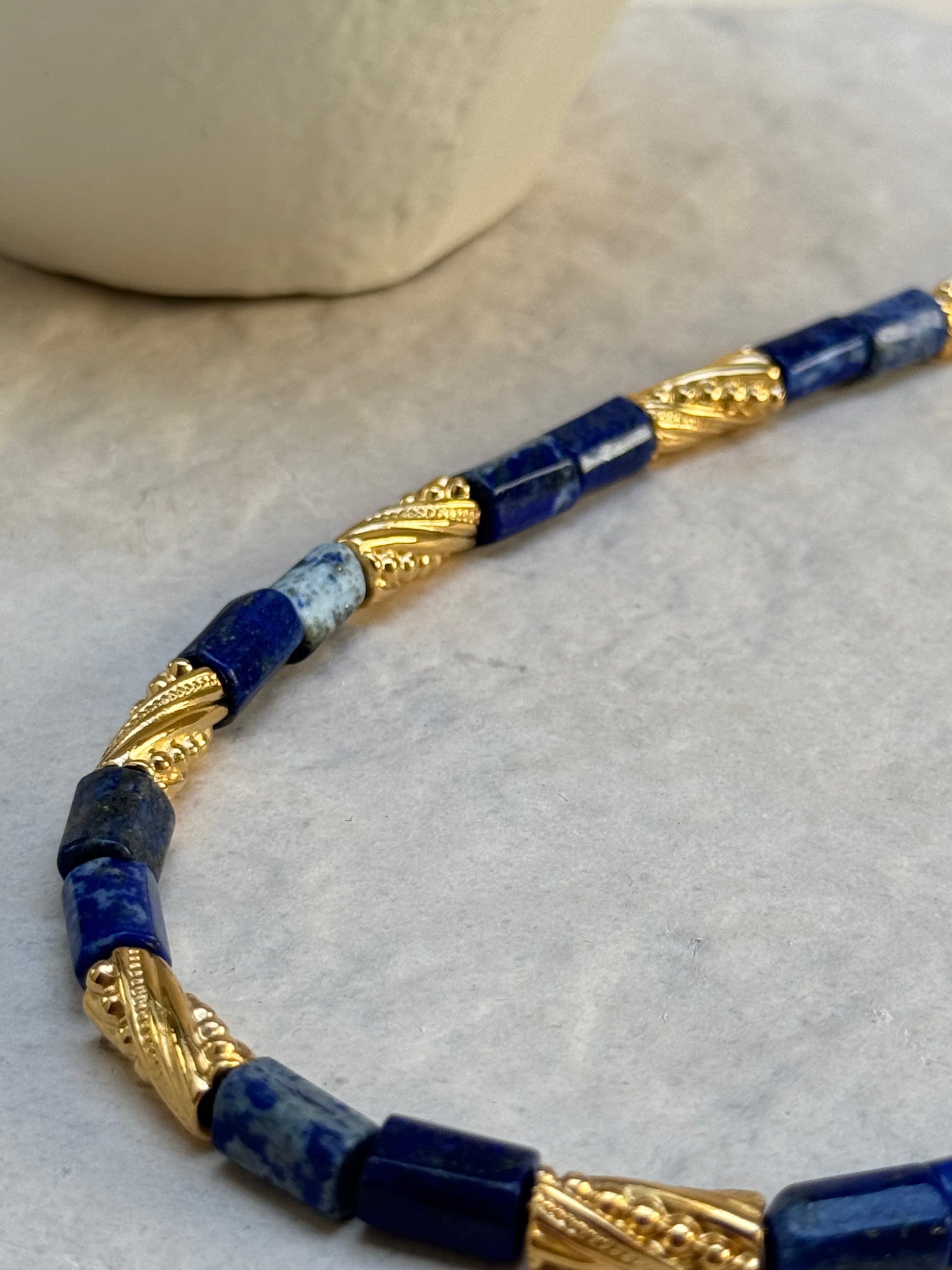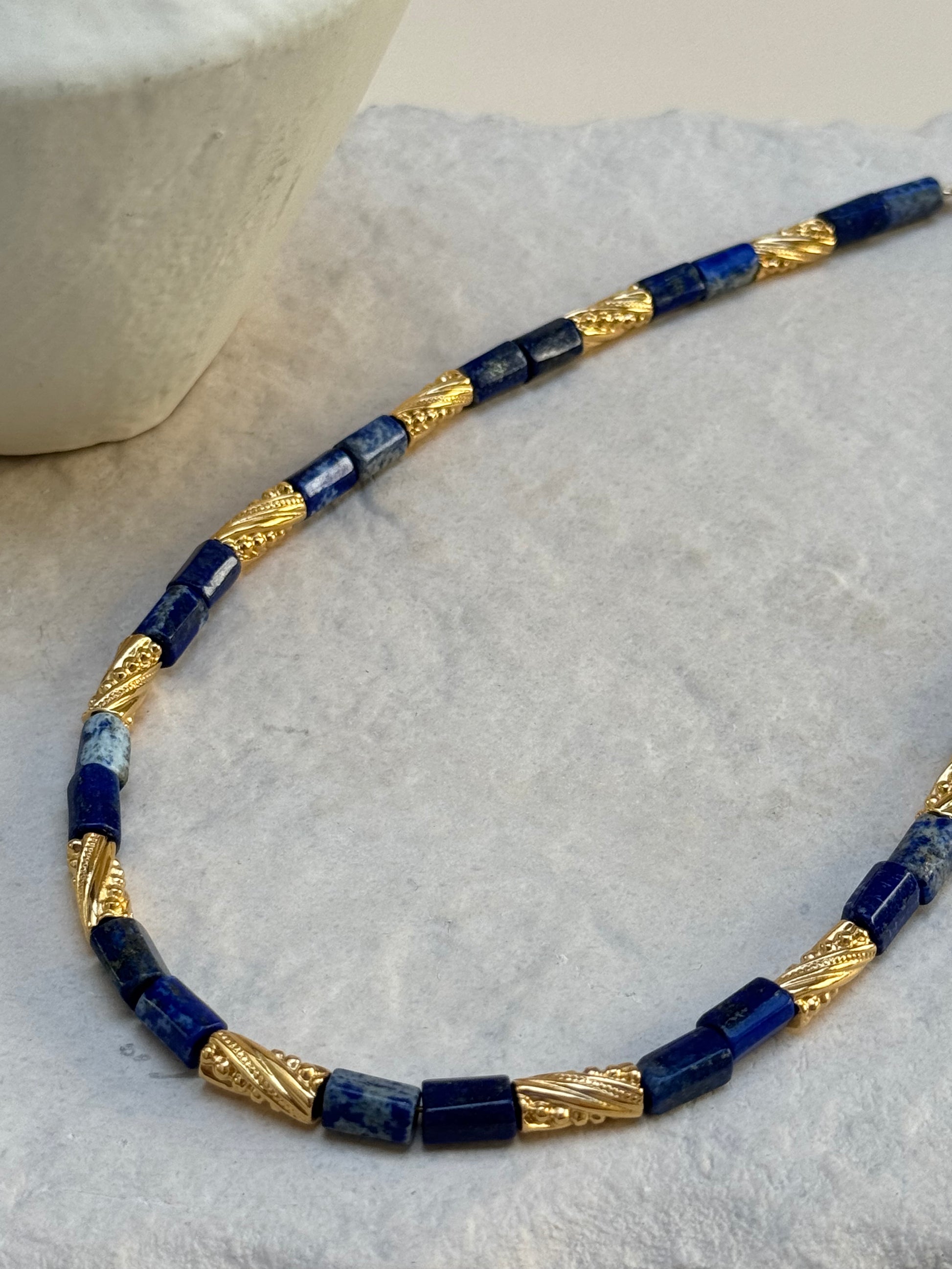 Détails : Chaine avec perles en acier inoxydable doré effet torsadé et pierres naturelles