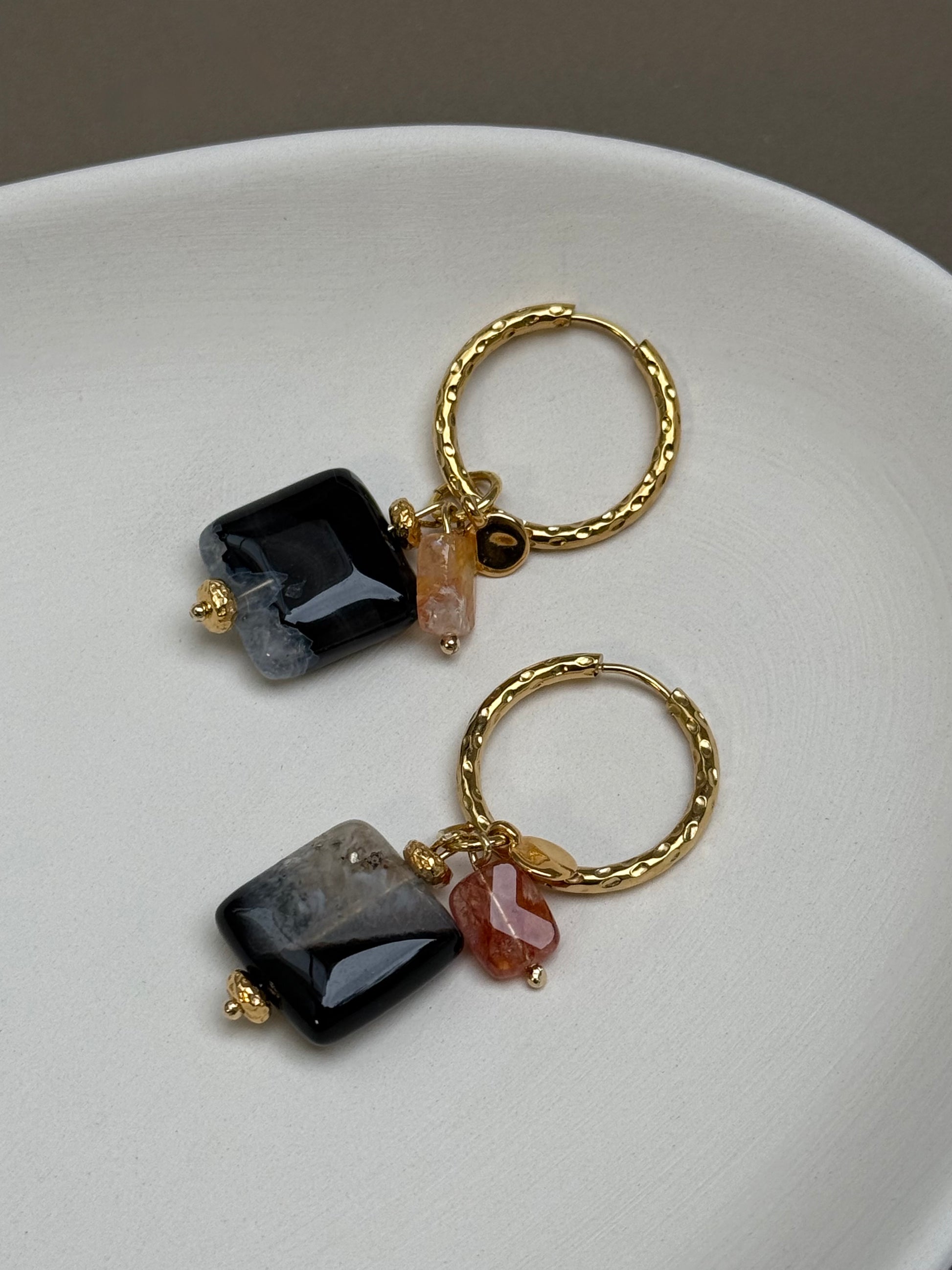 Détails : Des créoles martelées composées de perles de verre carrées aux style ethnique et des pierres naturelles.