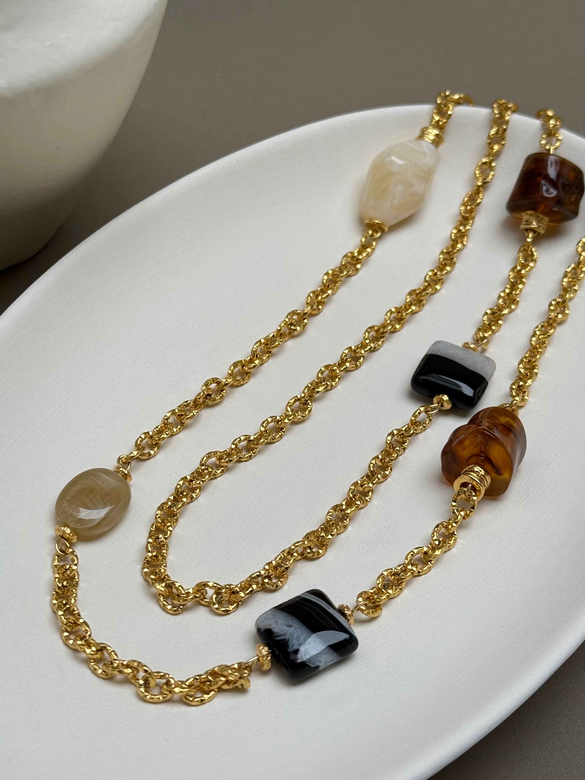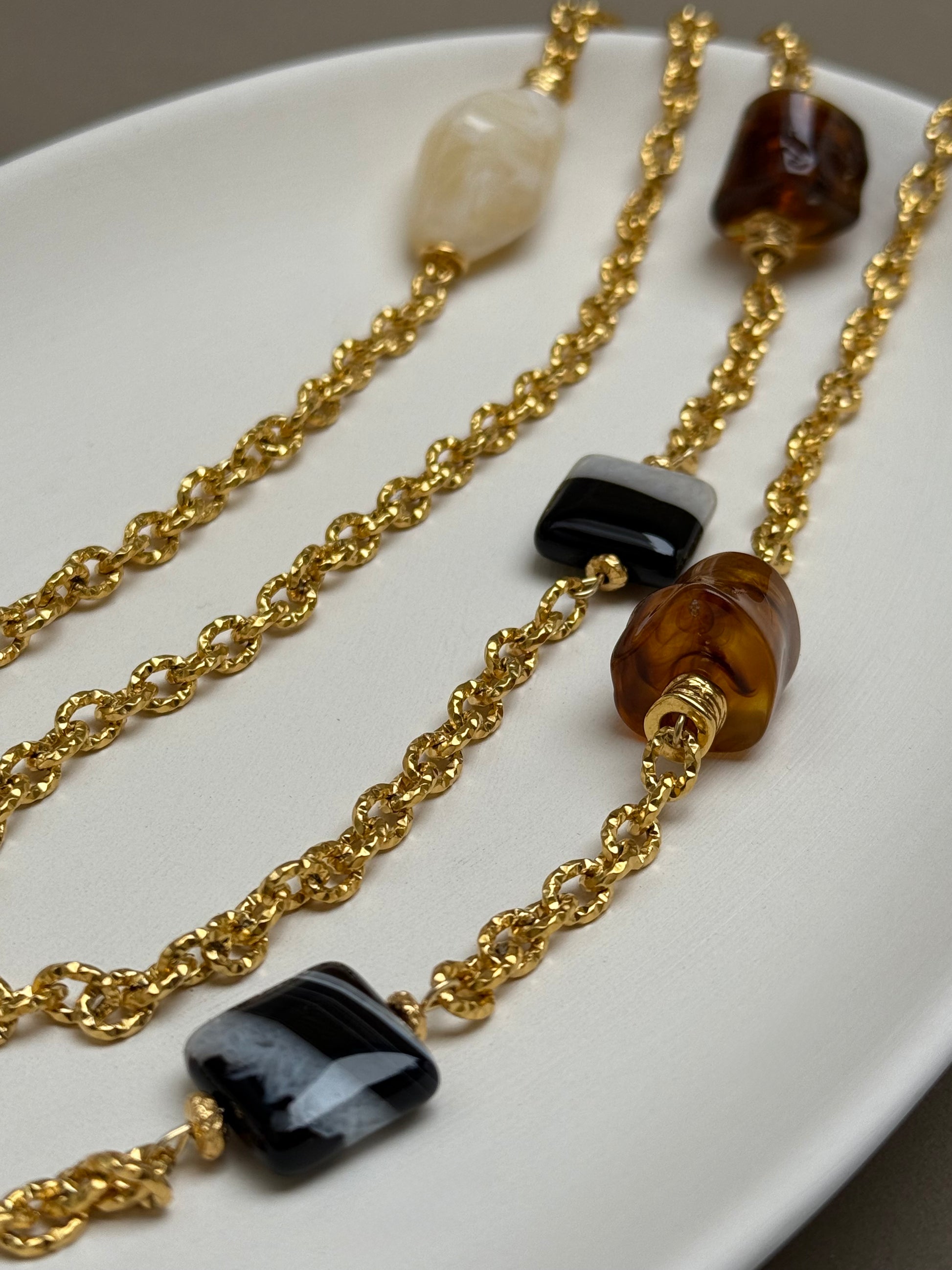 Détails : Sautoir à chaine épaisse composé de perle en acétate et en pierre naturelle.