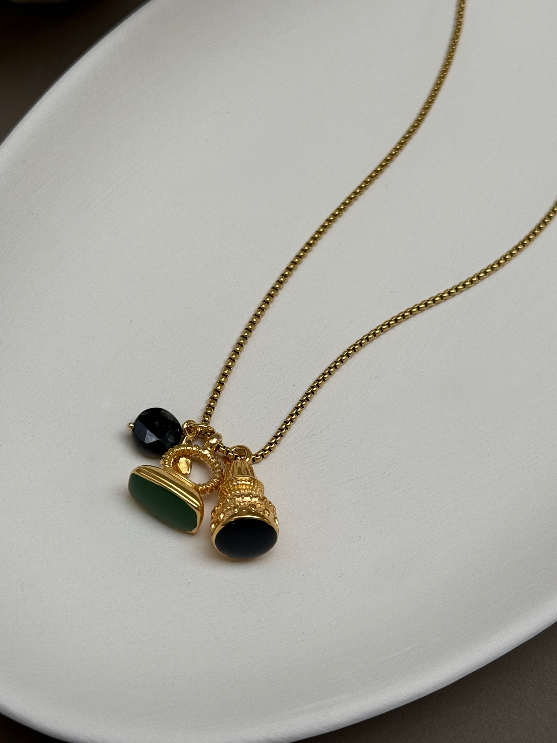 Détails : Sautoir à chaine épaisse composé de grigri émaillé noir et vert au style ethnique et d'une perle de verre noir