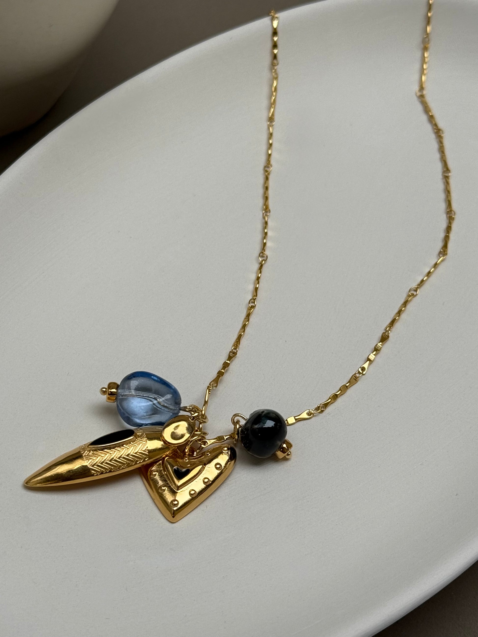 Détails : Sautoir à chaine crantée composé de grigri coeur, griffe, perle en acétate bleu et une perle en pierre naturelle
